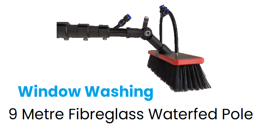 9 metre fibreglass waterfed pole. 5 sections of 1.8 metres to make 9 metres. Nylon angle adapter connected to 30cm brush complete with plastic pencil jets. Comes complete with 20 metres of hose.